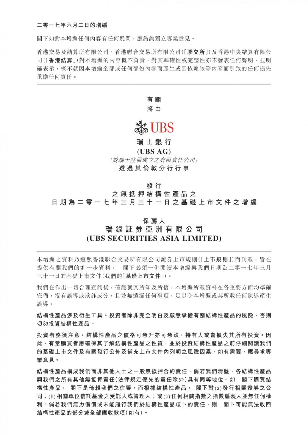 瑞士银行 – 基础上市文件之增编